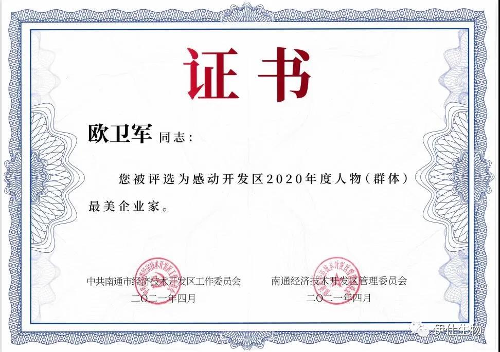歐總是南通市中青年科學(xué)技術(shù)帶頭人,2020年度江蘇省企業(yè)“創(chuàng)新達(dá)人”,伊仕生物是南通市新冠肺炎疫情防控重點保障企業(yè)。