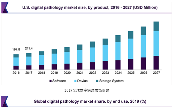 據(jù)2020年世界病理學(xué)大會(huì)報(bào)告,預(yù)計(jì)到2024年,病理學(xué)市場(chǎng)規(guī)模將從2019年的303億美元達(dá)到444億美元,從2019年到2024年的復(fù)合年增長(zhǎng)率為6.1%。據(jù)GrandViewResearch預(yù)測(cè),2019年全球數(shù)字病理學(xué)市場(chǎng)規(guī)模為7.676億美元,預(yù)計(jì)到2027復(fù)合年增長(zhǎng)率為11.8%。根據(jù)最終用途,醫(yī)院在2019年占據(jù)了領(lǐng)先的市場(chǎng)份額。醫(yī)院采用數(shù)字掃描技術(shù)以加快診斷速度并提高患者依從性。就收入而言,2019年北美市場(chǎng)份額最大。