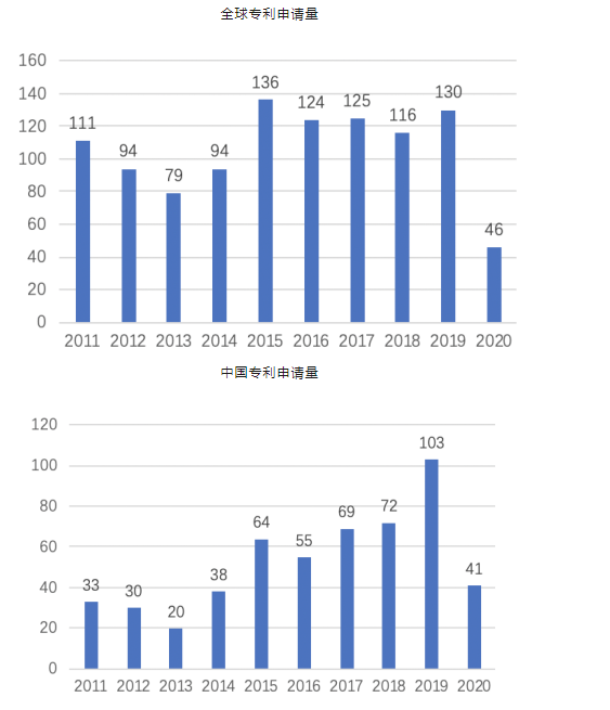 上圖所示為以“病理診斷”和“細(xì)胞病理”進(jìn)行全球檢索得到的近10年的專利申請(qǐng)情況。從圖中可以看出,病理診斷領(lǐng)域近10年約有1055件專利申請(qǐng)(由于發(fā)明專利有18個(gè)月公開(kāi)的滯后期,實(shí)用新型從申請(qǐng)到公開(kāi)也需一段時(shí)間,因此2019年和2020年數(shù)據(jù)有所偏差),其中發(fā)明專利604件、實(shí)用新型專利179件。從圖2中可以看出,全中國(guó)病理診斷領(lǐng)域近10年約有525件專利申請(qǐng)(由于發(fā)明專利有18個(gè)月公開(kāi)的滯后期,實(shí)用新型從申請(qǐng)到公開(kāi)也需一段時(shí)間,因此2019年和2020年數(shù)據(jù)有所偏差)。