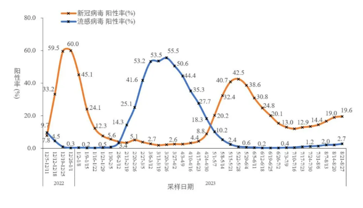 中疾控日前發(fā)布2023年8月全國(guó)新型冠狀病毒感染疫情情況顯示,全國(guó)哨點(diǎn)醫(yī)院流感樣病例新冠病毒陽性率從第31周(7月31日-8月6日)的14.4%緩慢上升至第34周(8月21日-8月27日)的19.6%。