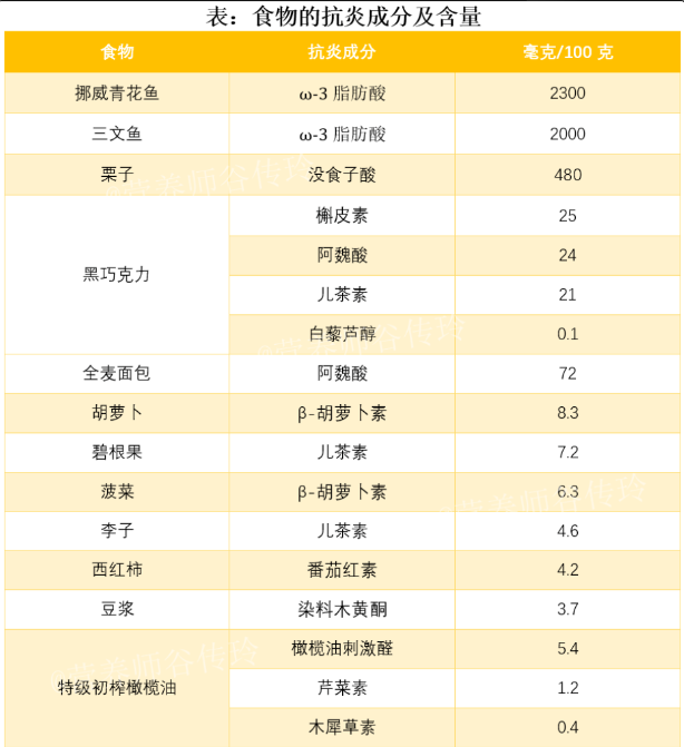 抗炎飲食可以改善體內(nèi)的炎癥因子,避免發(fā)展出疾病。比如:碳水化合物:推薦全谷物碳水化合物,比如藜麥、糙米、蕎麥、黑米等等。脂肪:多選擇單不飽和脂肪酸和多不飽和脂肪酸,比如魚蝦、貝類、亞麻籽油等含有多不飽和脂肪酸、歐米伽-3型脂肪酸。蛋白質(zhì):選優(yōu)質(zhì)蛋白質(zhì),如魚、家禽、雞蛋、瘦紅肉,以及低脂乳制品和大豆食品。蔬果:十字花科蔬菜和莓果類是最被推薦的“抗炎選手”。富含多酚、黃酮的食物:如綠茶、大豆等;香辛料:如姜黃、生姜、肉桂、肉蔻、大蒜等等在“抗炎飲食”榜上有名。⑥2023年5月國家注冊營養(yǎng)師谷傳玲根據(jù)文獻(xiàn)研究,整理出了12種“抗炎王者食物”,供大家日常飲食中參考。
